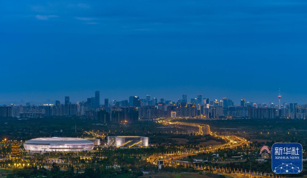 ↑从龙泉山俯瞰夜幕下的东安湖体育公园(7月23日摄)。新华社发(廖铁军摄)