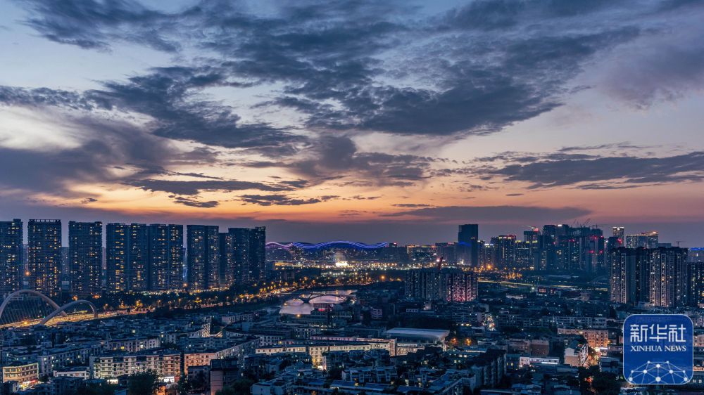 ↑夜幕下的成都高新区一角(7月9日摄)。新华社发(王琦摄)