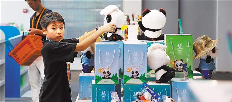 顾客在大运村艺术中心商超选购吉祥物“蓉宝”。目前,成都大运会围绕吉祥物“蓉宝”主题,累计推出玩具类、徽章类、文具类、邮票邮品等18大系列1000余款特许商品。