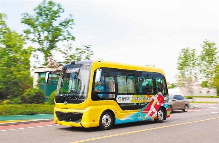 大运村内,媒体记者在体验无人驾驶巴士。