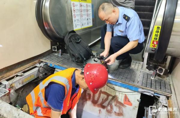 ▲福州火车站联合维保单位检查电梯井排水装置。 通讯员 韩毅/摄