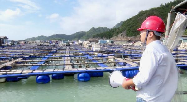 ▲干部手持喇叭,深入各渔排巡查,及时播报台风动态信息。