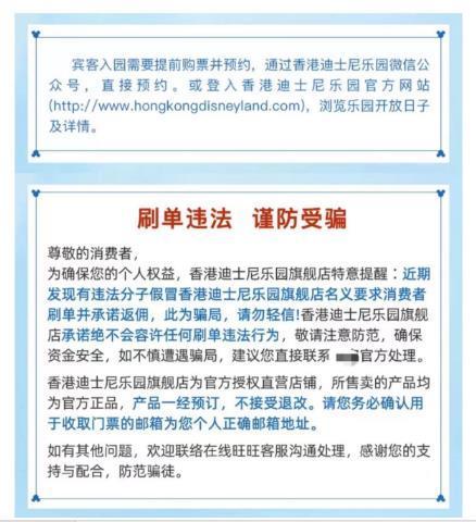 北青报记者注意到,在该旅游平台的香港迪士尼乐园门票购买页面上已经发布了“刷单违法谨防受骗”的告示,告示中称近期发现有违法分子要求消费者刷单并承诺返佣,这种情况为骗局。