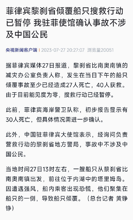 据菲律宾媒体27日报道,黎刹省比南奥南镇的减灾办公室负责人称,发生在当日下午的船只倾覆事故至少已经造成27人死亡,40人获救。由于目前能见度为零,搜救行动已经暂停。菲律宾倾覆船只搜救行动暂停此前,菲律宾海岸警卫队称,初步报告显示有30人死亡,但具体情况需进一步确认。此外,中国驻菲律宾大使馆表示,经询问负责营救行动的黎刹省地方警局,事故中不涉及中国公民。