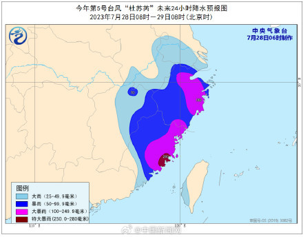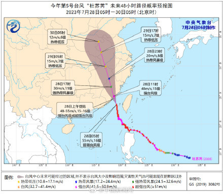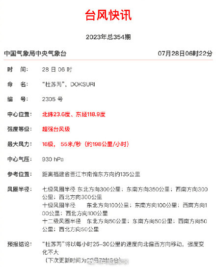 中央气象台7月28日06时继续发布台风红色预警。目前台风“杜苏芮”本体已“挤”进台湾海峡,并仍维持着超强台风级别,中心附近最大风速达到55米每秒。由于路径向北调整,登陆时间也略有后调。今天上午将在福建厦门到惠安一带沿海登陆,目前预报的登陆强度仍为强台风级或超强台风级。其本体风雨已经上岸影响厦门、泉州、漳州,最强风雨已经开启!@中国天气