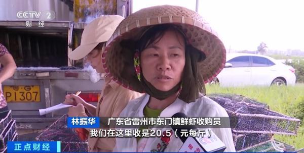广东省雷州市东门镇鲜虾收购员林振华:我们在这里收是每斤20.5元,去年这个虾每斤28元、26元。今年便宜了差不多5元、8元。