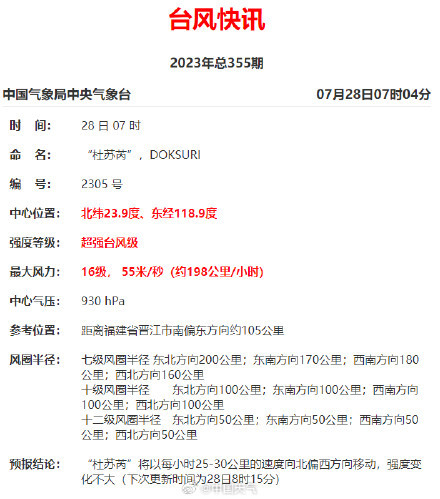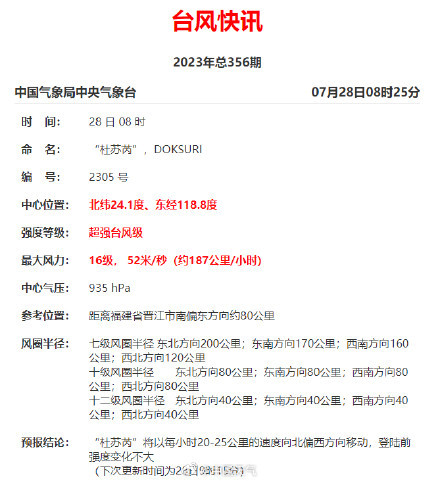 台风”杜苏芮“强度正在缓慢减弱,今天07时至08时左右,”杜苏芮“中心附近最大风力从55米/秒减弱到52米/秒,目前仍维持超强台风等级,@中国天气首席气象分析师@Walle胡啸表示,目前来看台风”杜苏芮“结构完整,但风眼不清晰、强度有所减弱,强风雨区域收缩,台风个头变,同时登陆点所有北移,需警惕登陆后强降雨和瞬时天气变化。