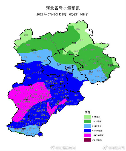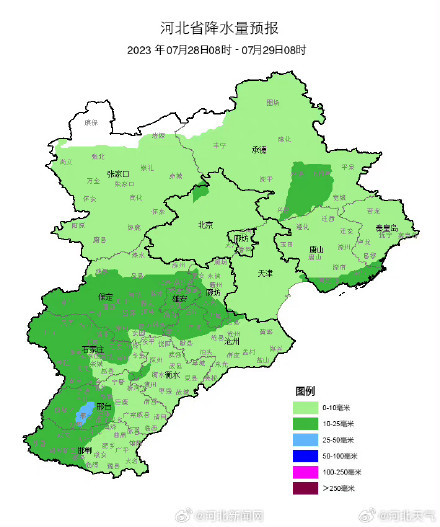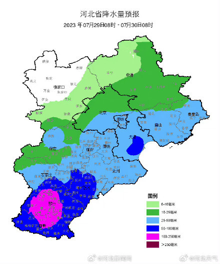 河北省气象台2023年07月28日05时发布天气预报今天白天到夜间,全省多云间阴,大部分地区有分散性雷阵雨或阵雨,其中保定、廊坊南部、雄安新区、石家庄、沧州西部、邢台、邯郸有中雨,个别地点有大雨到暴雨,雷雨时局地伴有短时强降水、短时大风等强对流天气。最高温度,张家口、承德、保定西部25~30℃,其他地区31~34℃。最低温度,张家口大部、承德大部、保定西北部13~20℃,其他地区21~25℃。明天白天到夜间,全省阴有雷阵雨或阵雨,其中唐山、秦皇岛和保定、廊坊及以南的部分地区有大雨到暴雨,个别地点有大暴雨。