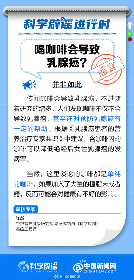咖啡不仅不会导致乳腺癌,甚至还对预防乳腺癌有一定的帮助。根据《乳腺癌患者的营养治疗专家共识》中建议,含咖啡因的咖啡可以降低绝经后女性乳腺癌的发病率。当然,这里谈论的咖啡都是没有任何添加的咖啡。(@科学辟谣@中国新闻网 )