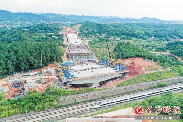 记者在现场看到,沪昆高铁从绿心内穿过,每隔几分钟便有一列动车呼啸而过,正在建设中的新韶山南路需上跨运营中的沪昆高铁,这给施工带来极大难度,成为一处关键控制性节点。