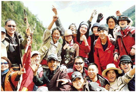 ▲塔公村村长尼玛降泽(手举最高者)早年与客人们的合影。本报记者王京雪翻拍