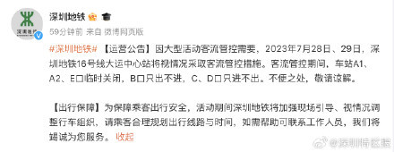 因大型活动客流管控需要,2023年7月28日、29日,深圳地铁16号线大运中心站将视情况采取客流管控措施。客流管控期间,车站A1、A2、E口临时关闭,B口只出不进,C、D口只进不出。不便之处,敬请谅解。