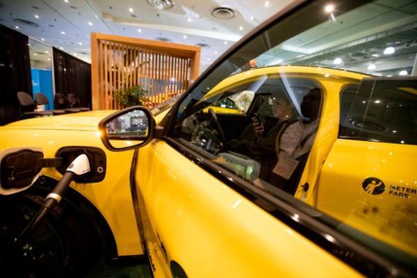 2022年4月15日,参观者在美国纽约国际车展上观看一款纯电动出租车。新华社记者王迎摄