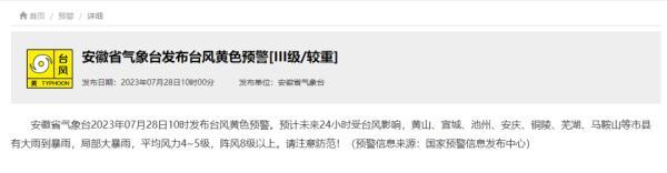 安徽省气象台2023年07月28日10时发布台风黄色预警。预计未来24小时受台风影响,黄山、宣城、池州、安庆、铜陵、芜湖、马鞍山等市县有大雨到暴雨,局部大暴雨,平均风力4~5级,阵风8级以上。请注意防范!(预警信息来源:国家预警信息发布中心)