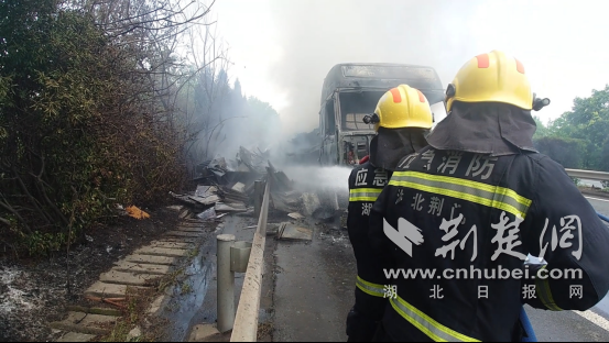 荆楚网(湖北日报网)讯(通讯员 魏欢欢 )7月27日11时02分,二广高速1706km处荆门往荆州方向一辆货车起火,荆门市消防救援支队指挥中心接到报警后,立即调派长坂坡路特勤站赶赴现场进行处置,随后又立即调派荆东消防站和月亮湖路消防站前往增援。