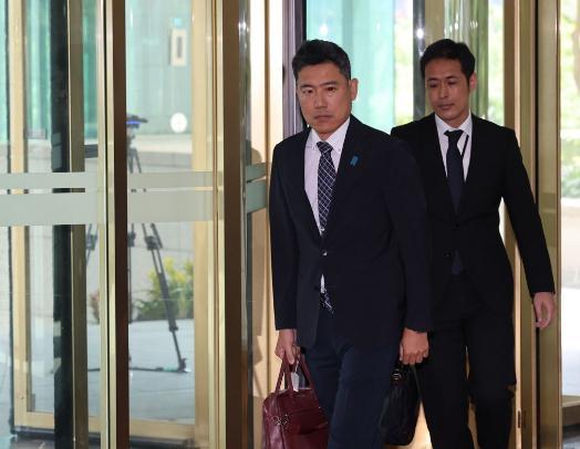 7月28日,韩国外交部召见代行日本驻韩使馆总括公使职务的政务公使山本文土,抗议日本在2023年版《防卫白皮书》中声索独岛主权。图为山本文土走进外交部大楼。来源:韩联社报道配图