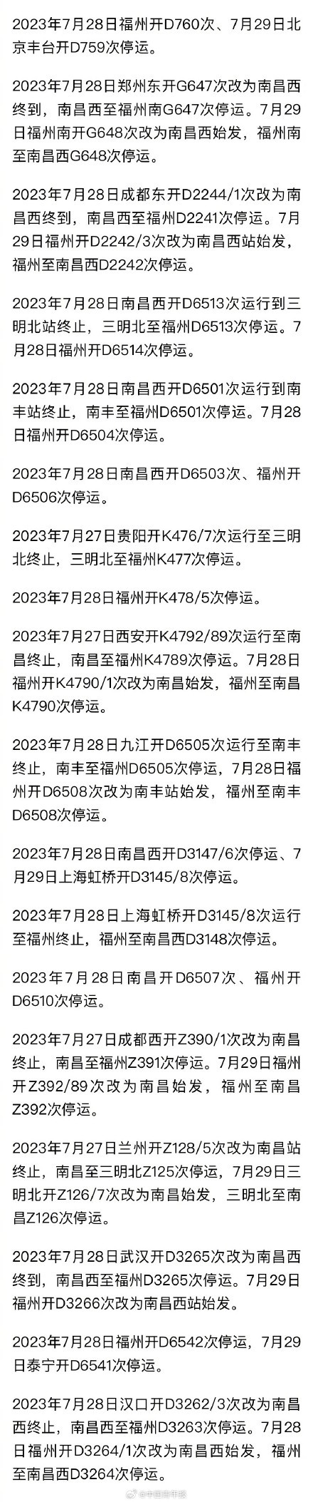今年第5号台风“杜苏芮”的中心已于今天上午10时许在福建晋江沿海登陆。记者刚刚从中国铁路南昌局集团有限公司获悉,为应对台风影响,确保铁路运输安全,南铁动态调整列车运行方案,于7月28日11时至23时停运途经(南)昌福(州)线的旅客列车。具体调整方案如下: