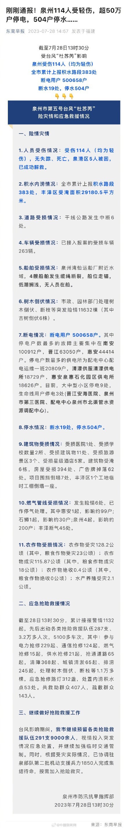 泉州市防汛抗旱指挥部28日消息,截至7月28日13时30分,受台风“杜苏芮”影响,泉州受伤114人(均为轻伤),全市累计上报积水路段383处,断电用户500658户,断水19处,停水504户。(东南早报)