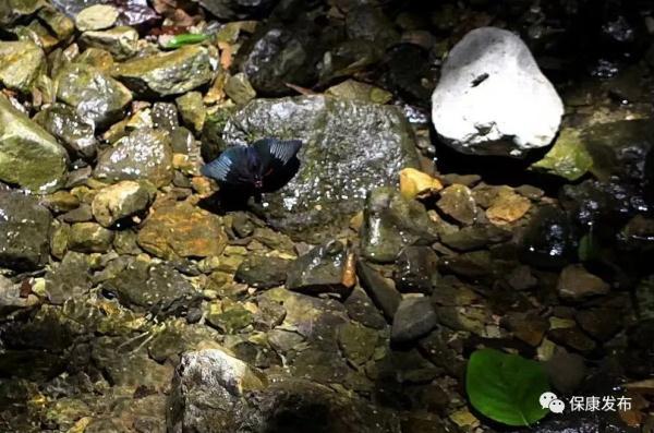 这两位游客为来自湖北省的一位资深生态摄影师及其女儿,他们利用暑假时间在五道峡保护区实验区内开展自然研学活动时,拍摄、记录到多种蝴蝶影像,其中就包括黑紫蛱蝶这一珍稀蝶种。其中一只黑紫蛱蝶雌蝶正好位于路中央,翅面非常完整,但反应较为迟钝,分析是刚羽化不久,到阳光充足的地方晾晒翅膀。他们在迅速完成拍摄后,随即将其移送到路边的绿植上,以免被过路的车碾压。此外,他们也观察到在峡谷中飞行迅捷的黑紫蛱蝶并记录到一只黑紫蛱蝶雌蝶在溪水中吸水的行为。