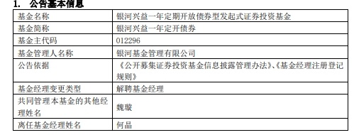 中国经济网北京7月28日讯 昨日,银河基金管理有限公司发布基金经理变更公告,何晶离任银河兴益一年定开债券(012296)。