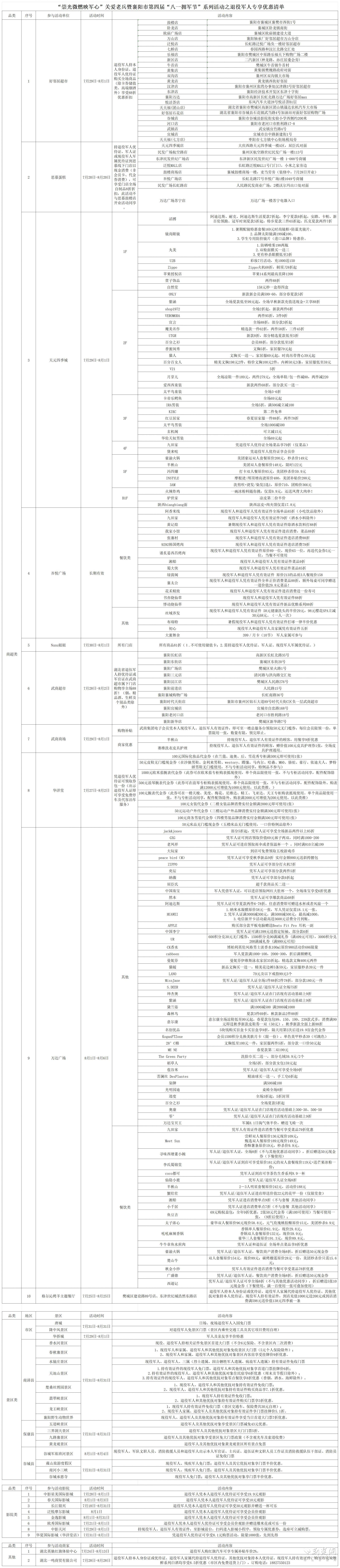 “崇光微燃映军心”关爱老兵暨襄阳市第四届“八一拥军节”系列活动之退役军人专享优惠清单。通讯员供图