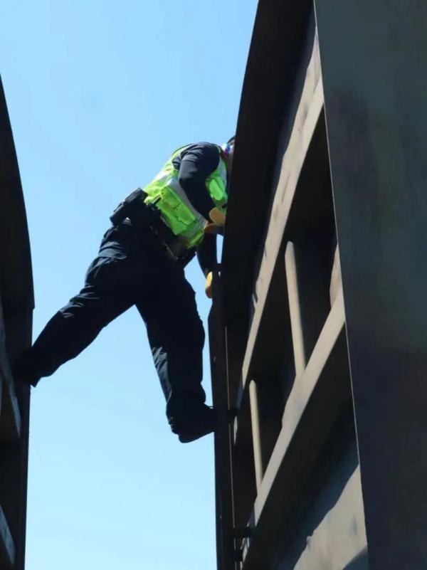 查缉出入境车辆需要走完整个车身,全程没有阴凉遮蔽,一趟下来要花近20分钟。在整个检查过程中,执勤民警除了需要做好列车底部情况检查外,还要爬到车顶,查看每一节车厢内的情况。“现在是下午三点钟,车体温度目前已超过50℃,我们要爬到车顶查看必须戴上电焊专用手套。”话毕,李峰峰和同事戴上手套,顺着梯子向车顶处攀爬。