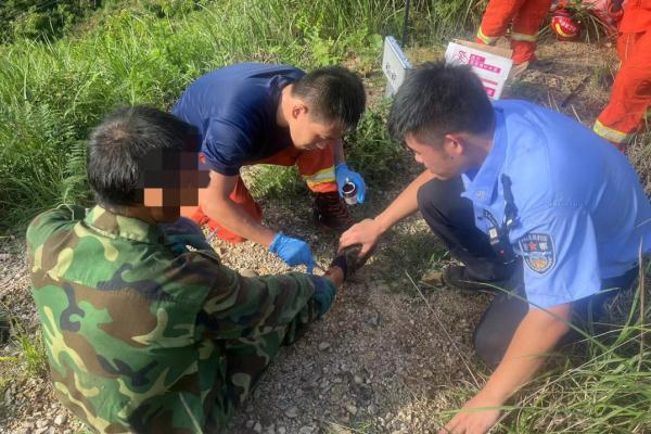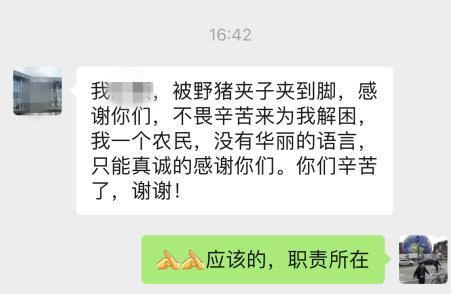 将野猪夹打开后,民警王泽平将黄先生护送至山下,对其进行简单消毒包扎。事后,黄先生发来微信,向民警表达了真挚的感谢。