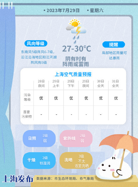 受“杜苏芮”外围影响,申城今夜到明天仍以阵性降水为主,短时雨量较大,局部可达暴雨。明天白天风力较大,东南风5级阵风6-7级,沿江沿海阵风8级,全天气温27~30℃。目前台风蓝色+雷电黄色双预警高挂,请注意防范。
