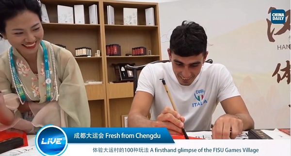 在成都大运村文化互动体验中心,中国日报记者偶遇意大利水球运动员体验中国文化,手握毛笔,学习写起了“福”字。