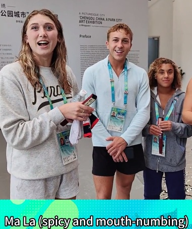 美国跳水队运动员表示,成都非常lush,给人的第一印象非常深刻。虽然大运村里有很多美食,但是他们还是非常想尝试下地道的“麻辣”感觉,“成都美食等着我们~”。