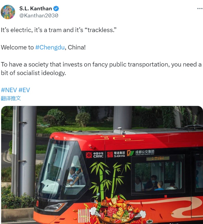 他在其社交媒体上写道,“欢迎来到中国成都!”这里的交通设施很棒,公共交通是电动的,是无轨电车。