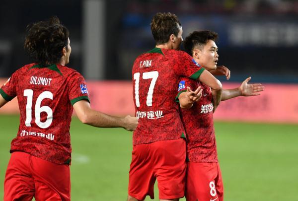 7月28日,河南队球员黄紫昌(右一)在比赛中与队友庆祝进球。新华社记者李嘉南摄