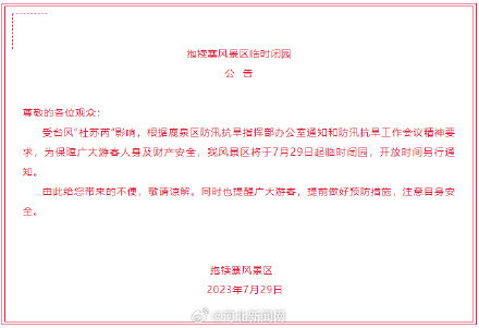 受台风“杜苏芮”影响,根据鹿泉区防汛抗旱指挥部办公室通知和防汛抗旱工作会议精神要求,为保障广大游客人身及财产安全,我风景区将于7月29日起临时闭园,开放时间另行通知。