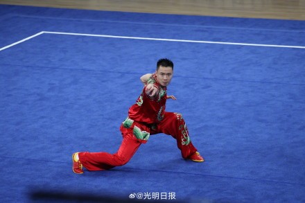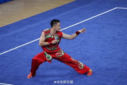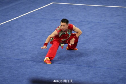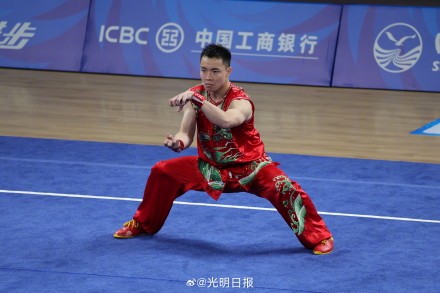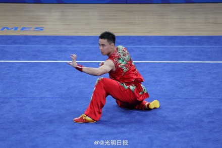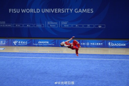 29日,在成都大运会武术项目男子南拳比赛中,中国选手曹茂园夺冠,摘得本届大运会首金。(光明日报全媒体记者陈城)