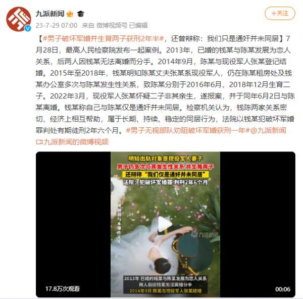 7月28日,最高人民检察院发布一起案例。2013年,已婚的钱某与陈某发展为恋人关系,后两人因钱某无法离婚而分手。2014年9月,陈某与现役军人张某登记结婚。2015年至2018年,钱某明知陈某丈夫张某系现役军人,仍在陈某租房处及钱某办公室多次与陈某发生性关系,致陈某分别于2016年6月、2018年12月生育二子。2022年3月,现役军人张某怀疑二子非其亲生,遂报案,并于同年6月2日与陈某离婚。钱某称自己与陈某仅是通奸并未同居。检察机关认为,钱陈两家关系密切、经济上相互帮助,属于长期、持续、稳定的同居行为,法院以钱某犯破坏军婚罪判处有期徒刑2年六个月。
