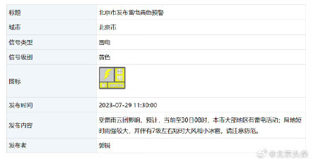 北京市气象局消息,受雷雨云团影响,预计,当前至30日08时,本市大部地区有雷电活动;局地短时雨强较大,并伴有7级左右短时大风和小冰雹,请注意防范。