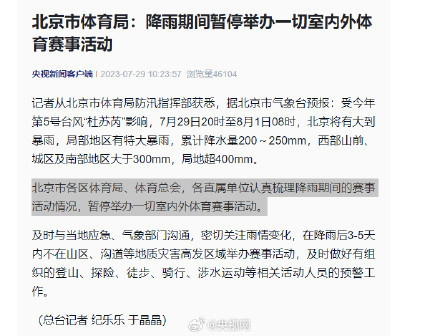 北京市各区体育局、体育总会,各直属单位认真梳理降雨期间的赛事活动情况,暂停举办一切室内外体育赛事活动。