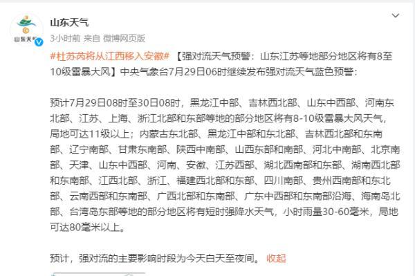 【强对流天气预警:山东江苏等地部分地区将有8至10级雷暴大风】