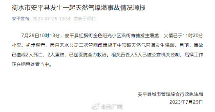7月29日10时13分,河北安平县红旗街金色阳光小区沿街商铺发生爆燃,火情已于11时20分扑灭。初步调查,因自来水公司二次管网改造施工中顶破天然气管道发生爆燃。目前,事故已造成2人死亡,2人重伤,已送医院全力救治。相关责任人5人已被公安机关控制,后续工作正在调查处置当中。(安平发布)