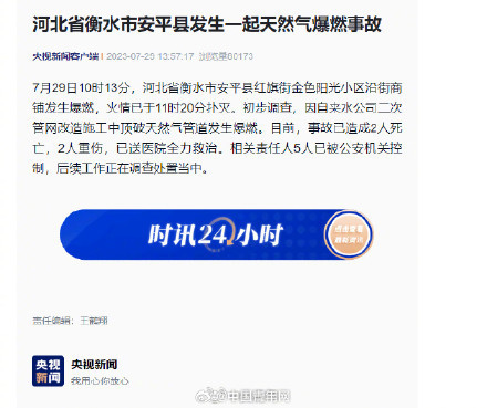 7月29日10时13分,河北省衡水市安平县红旗街金色阳光小区沿街商铺发生爆燃,火情已于11时20分扑灭。初步调查,因自来水公司二次管网改造施工中顶破天然气管道发生爆燃。目前,事故已造成2人死亡,2人重伤,已送医院全力救治。相关责任人5人已被公安机关控制,后续工作正在调查处置当中。