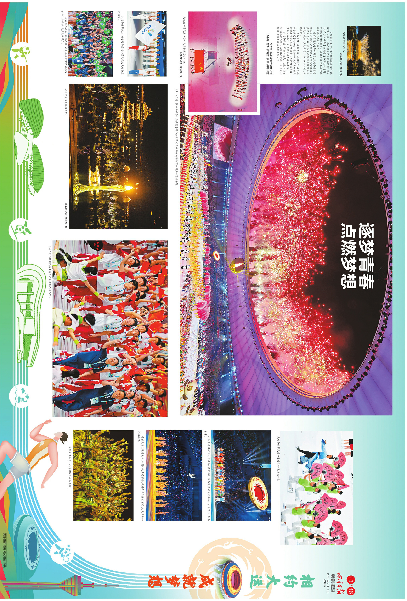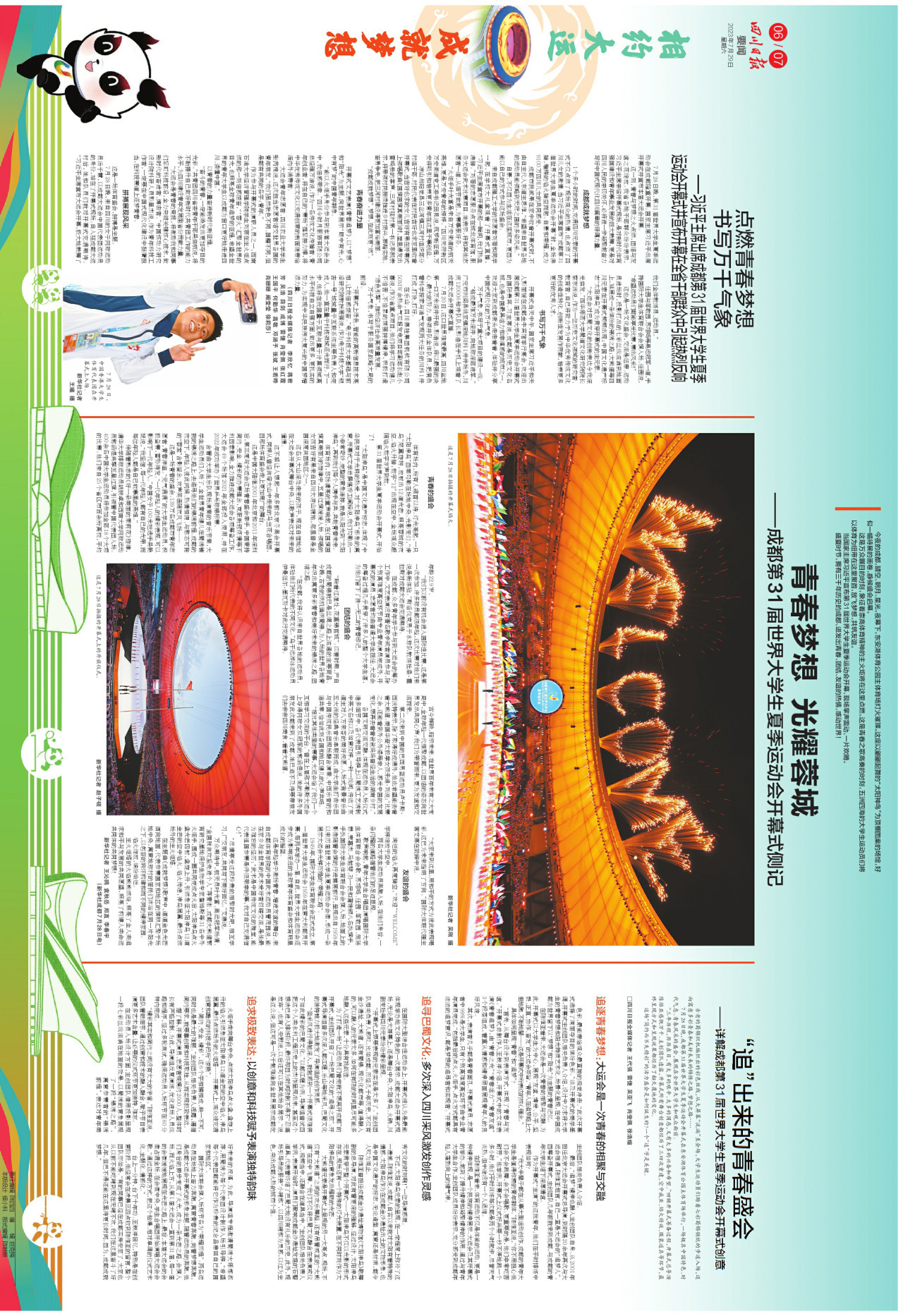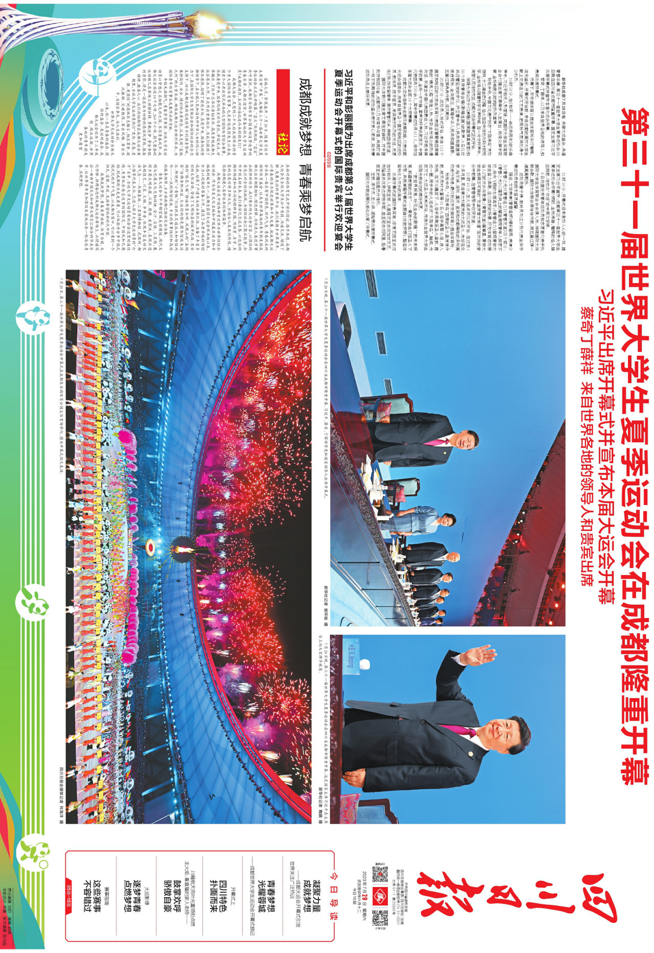 特别推荐今天的版面内容。前4个连版(共8个版),浓墨重彩呈现大运会重要时政新闻。第5个连版,可详看大运会开幕式上的四川元素。第6个连版,可细品大运会开幕式上的科技含量。第7个连版,详细介绍了今日赛事看点,和未来夺金点。第8个连版,一起回味开幕式上精彩瞬间。