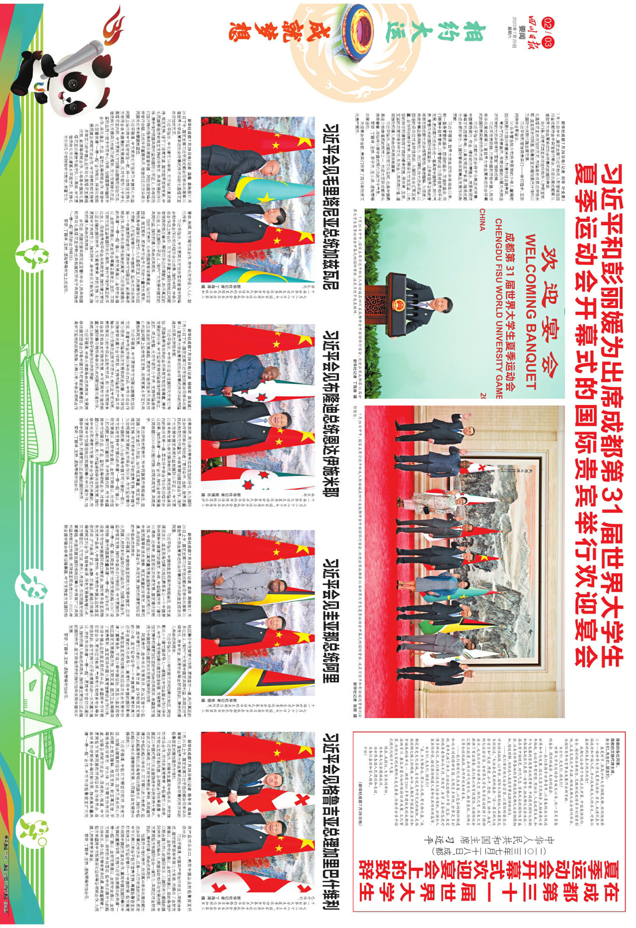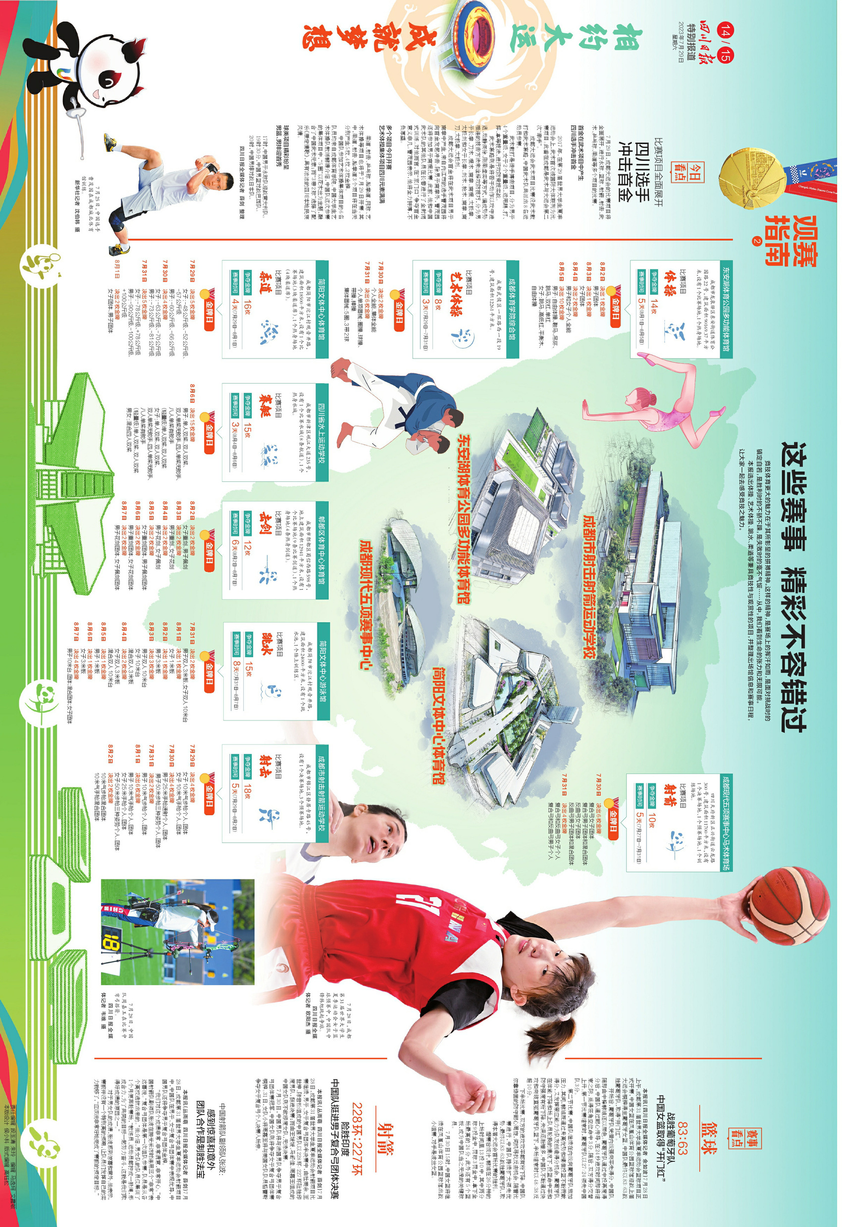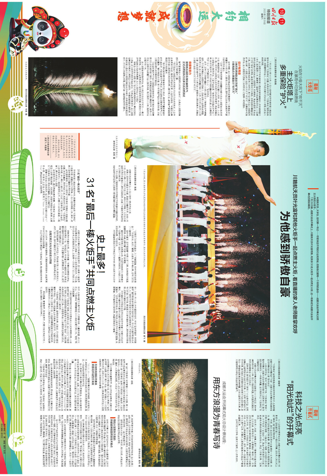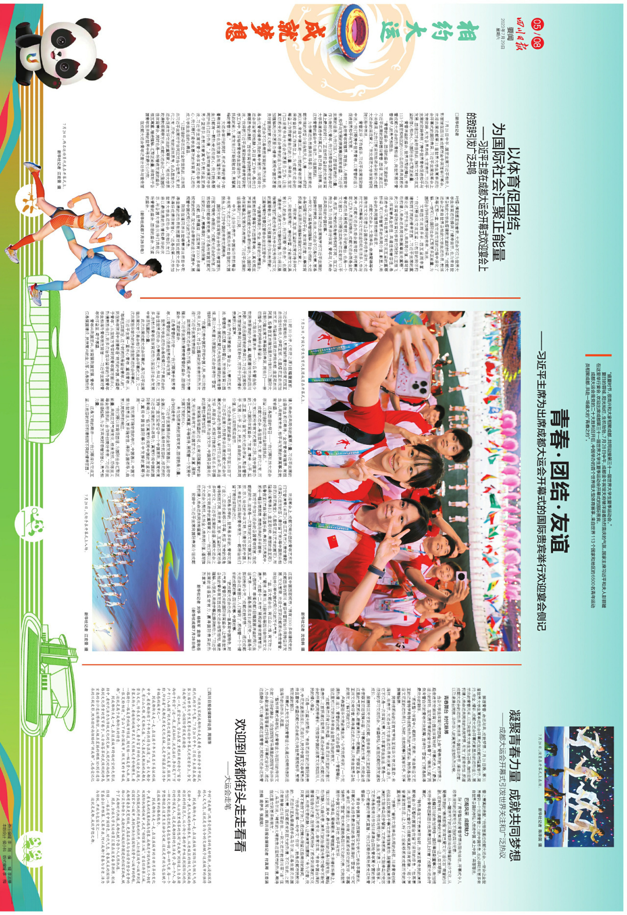 特别推荐今天的版面内容。前4个连版(共8个版),浓墨重彩呈现大运会重要时政新闻。第5个连版,可详看大运会开幕式上的四川元素。第6个连版,可细品大运会开幕式上的科技含量。第7个连版,详细介绍了今日赛事看点,和未来夺金点。第8个连版,一起回味开幕式上精彩瞬间。