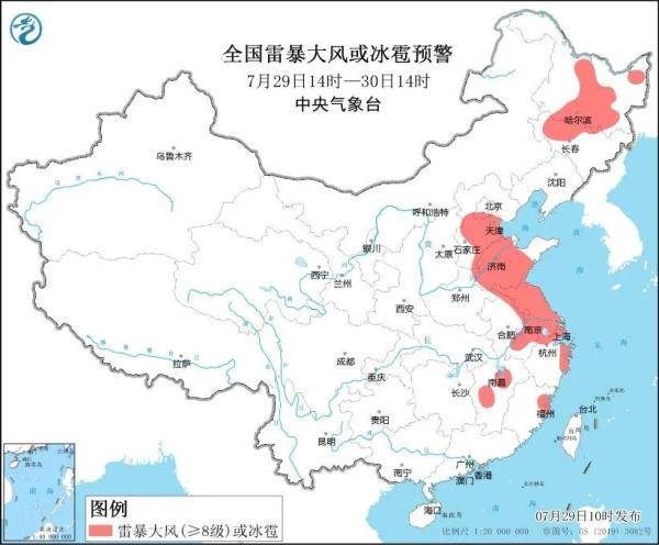 预计7月29日14时至30日14时,黑龙江中部和北部、吉林中西部、河北中南部、北京南部、天津中南部、山东中西部、河南东北部、安徽东部和南部、江苏、上海、江西中部、浙江北部和东部、福建东北部等地的部分地区将有8-10级、局地11级以上雷暴大风或冰雹天气;此外,黑龙江中部、山东中西部等地的局地可能伴有龙卷天气。