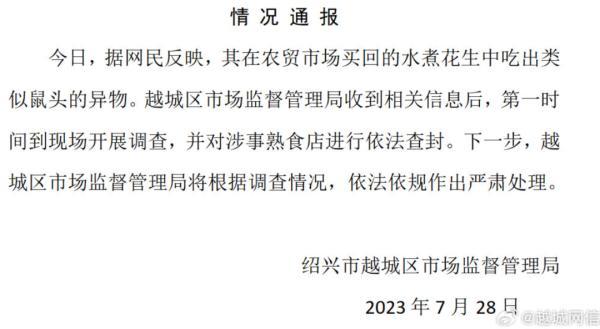 今日,据网民反映,其在农贸市场买回的水煮花生中吃出类似鼠头的异物。越城区市场监督管理局收到相关信息后,第一时间到现场开展调查,并对涉事熟食店进行依法查封。下一步,越城区市场监督管理局将根据调查情况,依法依规作出严肃处理。