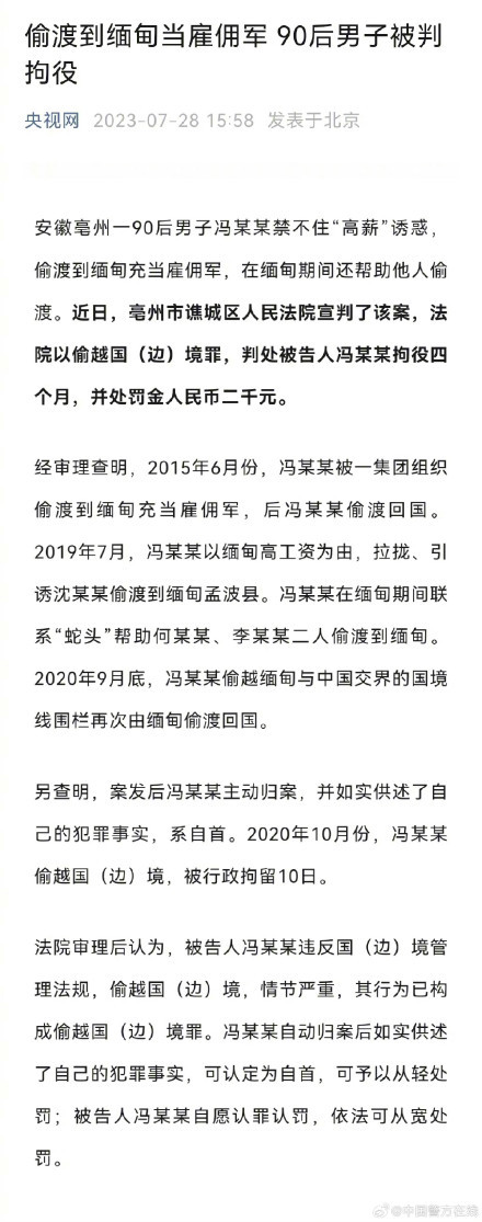 禁不住“高薪”诱惑,安徽亳州一“90后”男子冯某某,竟偷渡到缅甸充当雇佣军,在缅甸期间还帮助他人偷渡。近日,亳州市谯城区人民法院宣判了该案,法院以偷越国(边)境罪,判处被告人冯某某拘役四个月,并处罚金人民币二千元。境外“高薪”危险重重,偷越国(边)境构成犯罪,保持清醒,勿入陷阱!(央视网)