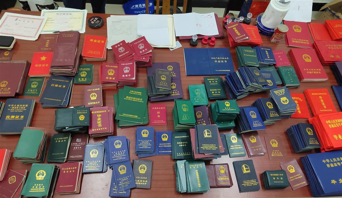 民警顺藤摸瓜将刘某抓获,又根据刘某交代的内容,锁定并抓获制造假证的李某夫妇,现场查获各类假证成品和半成品1000余本,假印章2000余个及多套制假设备。