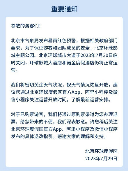 北京市气象局发布暴雨红色预警,根据相关政府部门要求,为了保证游客和团队成员的安全,北京环球影城主题公园、北京环球城市大道于2023年7月30日临时关闭,环球影城大酒店和诺金度假酒店仍将正常运营。已购票游客,可通过原购票渠道办理退票。