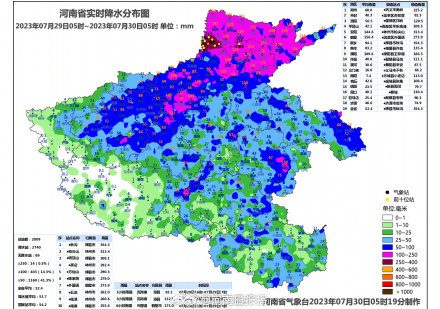 位列前三的分别为:辉县市秋沟 354.3 毫米、林州市柏尖山 313.4毫米、辉县市轿顶山 308.1 毫米。最大小时降水量为滑县瓦岗寨 83.1 毫米(7 月 29 日 16 时至 17时)。