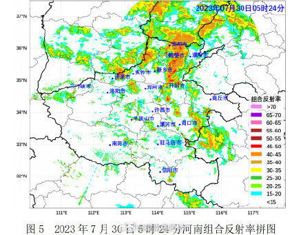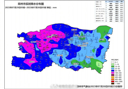 郑州市 24 小时降水: 29 日 5 时至 30 日 5时,郑州西部出现暴雨或大暴雨,全市平均降水量 68.0 毫米,最大降水量为巩义市南岭 225.2 毫米,最大小时降水量为荥阳 56.2毫米(7 月 29 日 12 时至 13 时)。