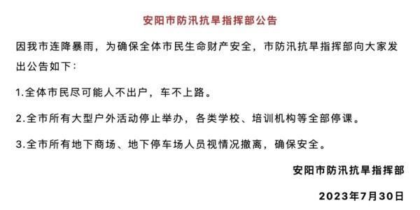 据安阳发布消息,7月30日晨,安阳市防汛抗旱指挥部发布公告: